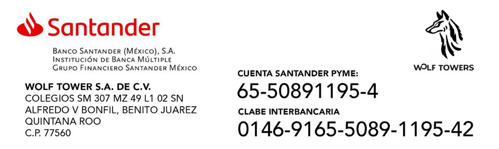 En el caso de depósitos y/o transferencias bancarias, es obligatorio que el “Cliente Potencial” notifique su pago al departamento comercial de manera inmediata a la fecha de su apartado, mediante un correo electrónico a: info@wolftowers.com que incluya su comprobante escaneado.